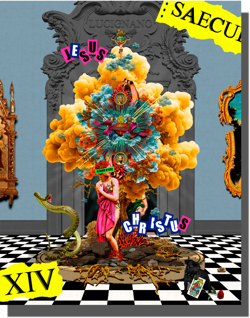 L’opera raffigura un albero dalle chiome dorate e vaporose che affonda le sue tentacolari radici su una scacchiera bianco e nera simboleggiando il bene ed il male, mentre Il tronco dorato e robusto poggia su una antica tavola zodiacale. L’opera vuole rappresentare la connessione tra l’amore sacro e spirituale del Cristo e l’amore piu materiale e fisico dell’uomo, raffigurato da una sensuale Venere Italica ed uno statuario David Michelangiolesco che ripettivamente rappresentano il femminile ed il maschile come sorgente di vita, amore e prosperità. In primo piano sulla destra un piccolo carlino simboleggia la fedeltà e sostiene con la zampa un’ antica carta degli innamorati. Sulla sinistra del quadro invece troviamo un ingannevole serpente seduttore, che simboleggia le perfide insidie della vita con chiare evocazioni al sarpente di Adamo ed Eva. Nel centro dell’albero emerge da un vortice luminoso il sacro cuore di Gesù sostenuto da San Pietro e San Giovanni, che irradia luce ed amore. La parte superiore culmina con la crocefissione di Gesù e due pellicani come rappresentati nell’albero originale. L’0pera rivisitata è caratterizzata da un cromatismo vivace ed un linguaggio pop contemporaneo che riscrive l’iconografia originale dando una visione più moderna e folcloristica.