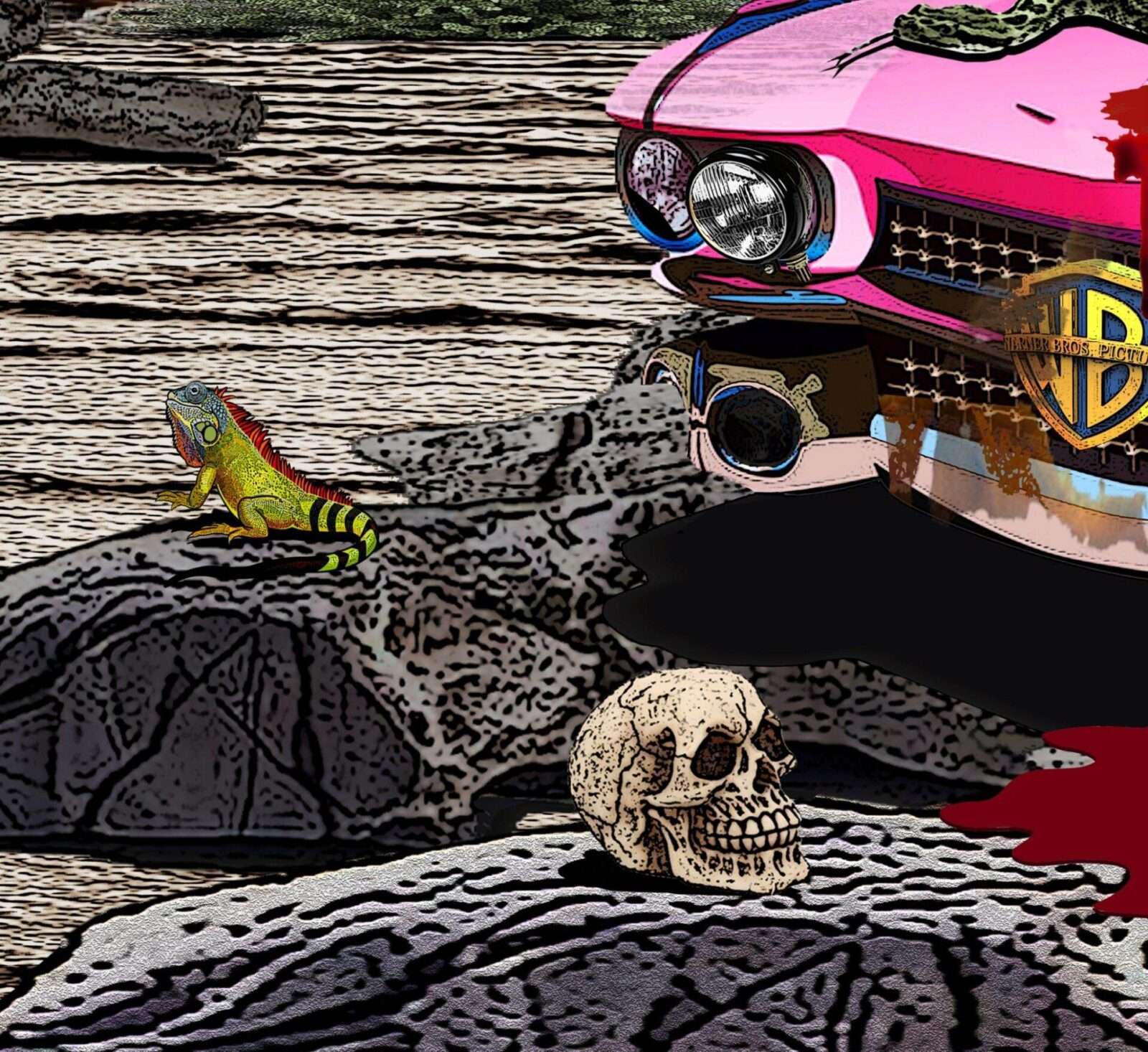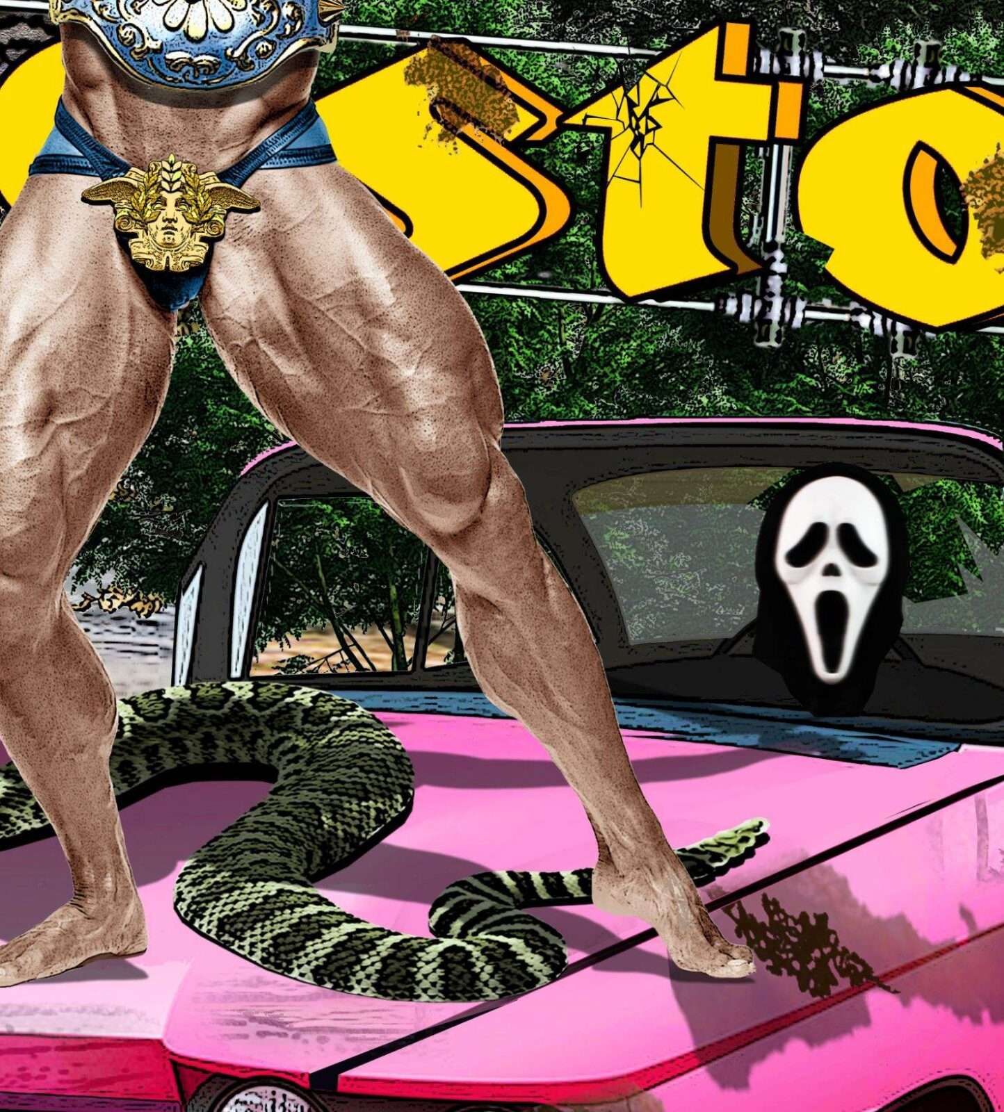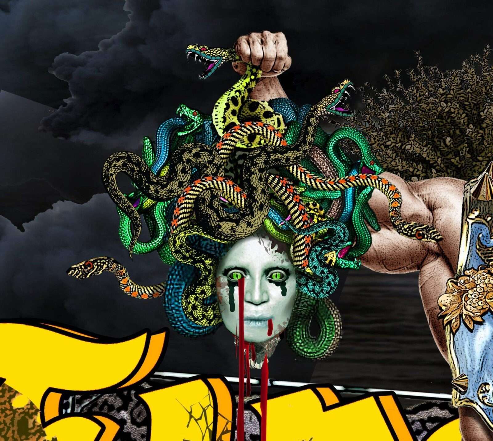 The work depicts two figures from Greek mythology: the heroic Perseus, son of Zeus, victoriously brandishing the severed head of the fearsome dying Medusa. The scene unfolds in an ancient, devastated landscape, featuring fossil remains, but also elements of contemporary pop culture. The Marian apparition, symbolizing the victory of good over evil, is highly evocative.