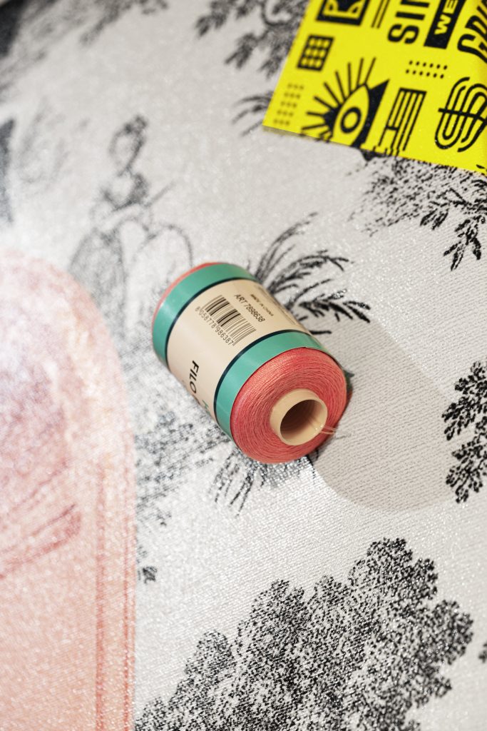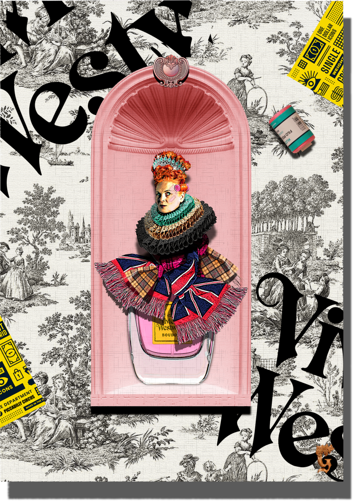 A work dedicated to the eccentric British fashion designer Vivienne Westwood, with her eclectic, innovative look and decidedly unconventional personality. Here she is depicted as a 17th-century queen, nestled in a museum niche, covering the bottle of her unmistakable perfume with a ruff and drapes.