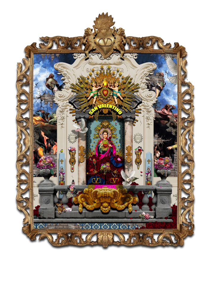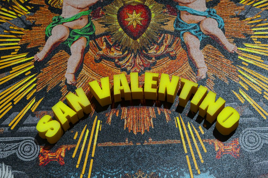 L’opera rappresenta un dimesso ed insolito Valentino Garavani nelle vesti di San Valentino, dove l’artista esprime il suo sofisticato umorismo giocando sull’ omonimia del celebre stilista ed il santo protettore degli innamorati. Un’iconografia di stampo decisamente ecclesiastico, ma ironicamente interpretata con elementi marcatamente profani, che richiamano il mondo della moda, dove l’amore sacro incontra quello più materiale. Il sottile e riverente sarcasmo caratterizza tutta l’opera, dall’abbondanza delle rose rosse che traboccano dal cancelletto della nicchia marmorea, ai numerosi ex voto e oggetti personali lasciati dai devoti in segno di ringraziamento o richieste di grazia per un amore iniziato, recuperato o strappato. Spiritoso il reliquiario contenente oggetti piu profani come gli attrezzi da sartoria e preziosi,familiari al celebre couturier.