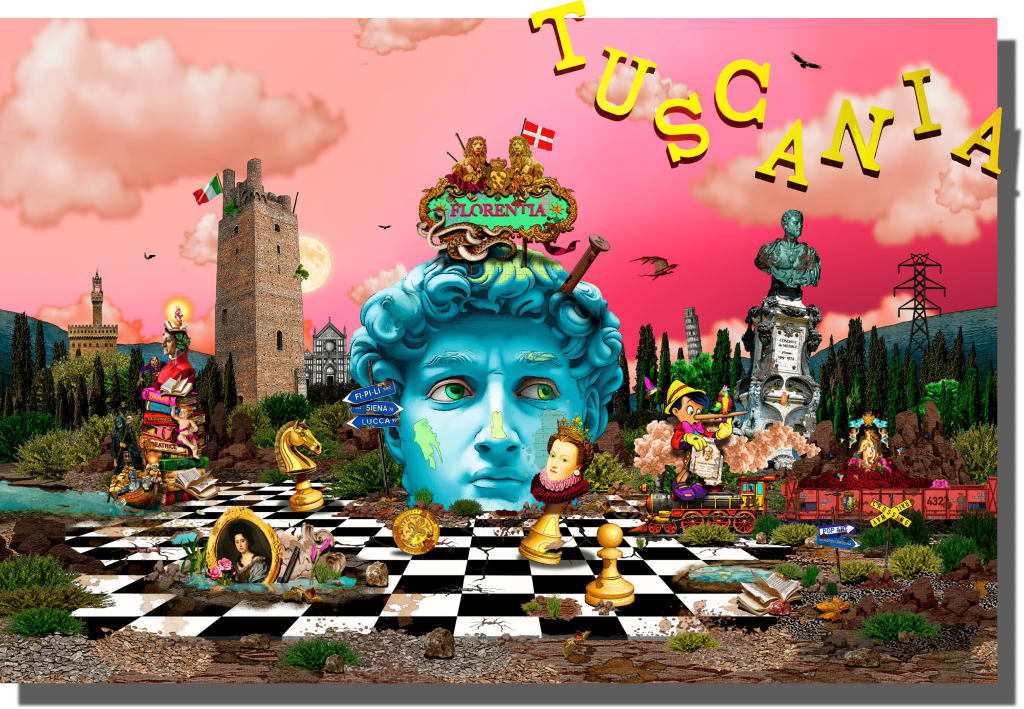 L’opera è dedicata interamente alla Toscana in un viaggio tra passato e presente. Terra da sempre ricca di arte, cultura, potere, passando dalla colta letteratura di Dante Alighieri alla nobile e potente dinastia dei Medici. Un maestoso David di Michelangelo domina la scena centrale, mentre la Venere del Botticelli mostra la sua femminile bellezza vestita di fiori e farfalle. Visibili i contrasti cromatici del bianco e nero in riferimento alle antiche fazioni dei Guelfi e i Ghibellini.
